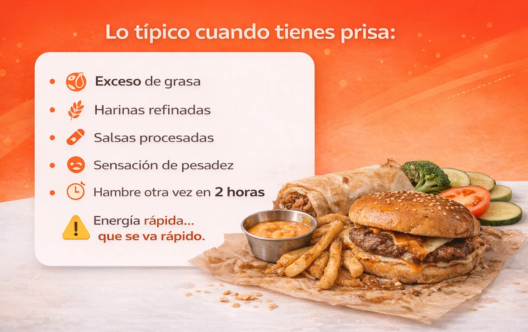 Energía que sube rápido… y baja igual de rápido. Sensación de pesadez y hambre otra vez en poco tiempo. • Exceso de grasa • Harinas refinadas • Salsas procesadas • Energía inestableEL CUERPO LO RESIENTEPero puedes elegir diferente